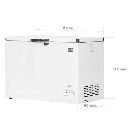 Este congelador mide 111 cm de Ancho × 82.6 cm de alto × 60 cm de profundidad. Si necesitas uno más pequeño puedes ver el Congelador tapa cerrada 9 pies³ o si necesitas uno más grande, puedes ver el Congelador tapa cerrada 12 pies³