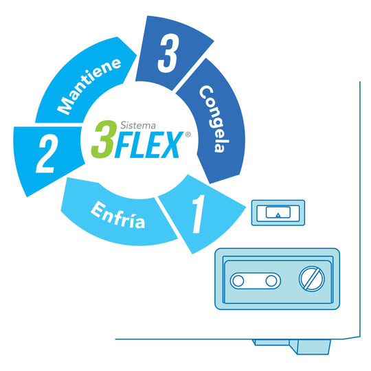 ¿Necesitas enfriar tus aguas gaseosas, jugos o cervezas? ¡Lo puedes hacer! ¿Necesitas guardar helados? ¡Lo puedes hacer! ¿Necesitas hacer hielo? ¡Lo puedes hacer! Con su novedosa tecnología 3Flex, este congelador permite manejar 3 rangos de temperatura para ajustarse a tus necesidades. El rango de temperatura Enfriador va de 10°C a 0°C y puedes almacenar todo tipo de bebidas gaseosas, jugos naturales, mantequilla, leche, crema, requesón, yogur, frutas y verduras. El rango de temperatura Mantenedor que va de -1°C a -7°C es ideal para pescados, camarones, pulpo, cangrejo, tortitas de carne para hamburguesas, pollo, gallina, medallones, pavo y demás aves. Y el rango de temperatura Congelador, que va de -8°C a -18°C es idóneo para carne de res, carne de cerdo, carne de cordero, carne de cabra, carne de conejo, helados, choco bananos, nieves y hielo.