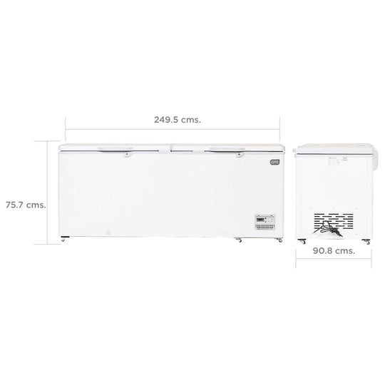 Este congelador mide 249.5 cm de Ancho × 75.7 cm de alto × 90.8 cm de profundidad. Si necesitas uno más pequeño puedes ver el Congelador tapa cerrada 27 pies³ .