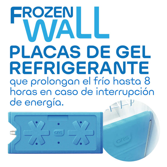 Placas de gel refrigerante: ¿Se fue la luz? No entres en pánico. En caso de interrupción en la corriente eléctrica el sistema de placa Frozen Wall mantiene la temperatura interna. · Congela hasta por 1 hora. · Conserva el frío hasta por 8 horas. Además,las placas funcionan como paredes internas para organizar mejor tu producto.