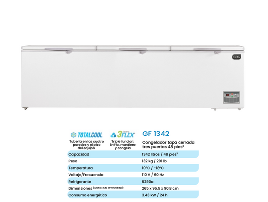 Congelador tapa cerrada horizontal tres puertas 48 Pies³