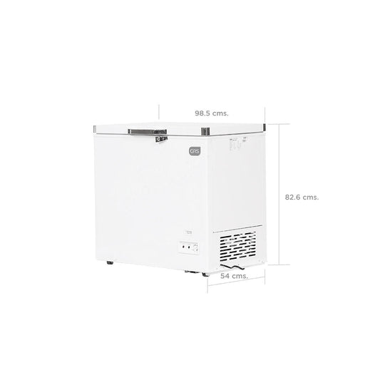 Este congelador mide 98.5 cm de Ancho × 82.6 cm de alto × 54 cm de profundidad. Si necesitas uno más pequeño puedes ver el Congelador tapa cerrada 7 pies³, o si necesitas uno más grande, puedes ver el Congelador tapa cerrada 10 pies³.