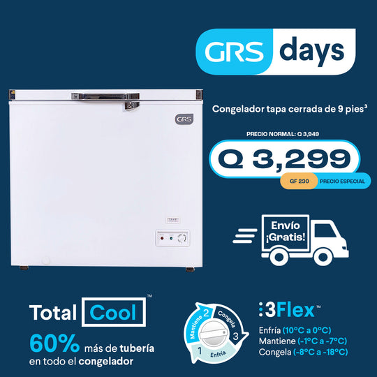 GRS se ocupa de la seguridad de tu inversión. Por eso, el congelador GRS GF 230 de 9 pies³ tiene puerta con cerradura para dejar con llave tus productos. Esto es sumamente valioso si tu puesto o tienda está en un mercado o en lugar público.