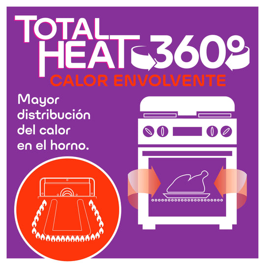 Nuestros hornos cuentan con doble vidrio que aísla el calor y con sistema de horneado envolvente de 360 grados (tecnología Total Heat), que contribuye a acelerar la cocción de sus alimentos.