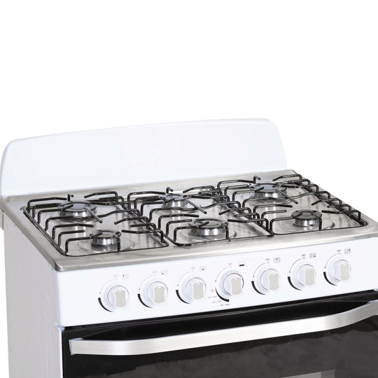 El modelo 30GE2, con seis quemadores de diferente tamaño, top de acero inoxidable, panel trasero sellado y parrillas de alambrón y horno con parrillas autodeslizables, le da muchos más beneficios.