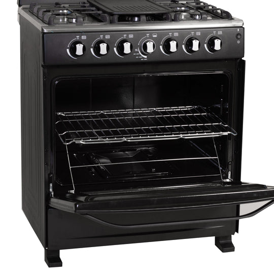 El modelo 30GM2B, con seis quemadores de diferente tamaño, top de acero inoxidable, panel trasero sellado, comal porcelanizado, encendido eléctrico, luz en el horno, parrillas de alambrón vertical y horno con parrillas auto deslizables, le da muchos más beneficios.