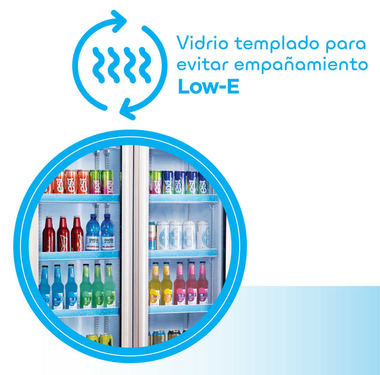Doble capa de vidrio templado: Exhibe sin empañar, conserva la temperatura interna y reduce la condensación.